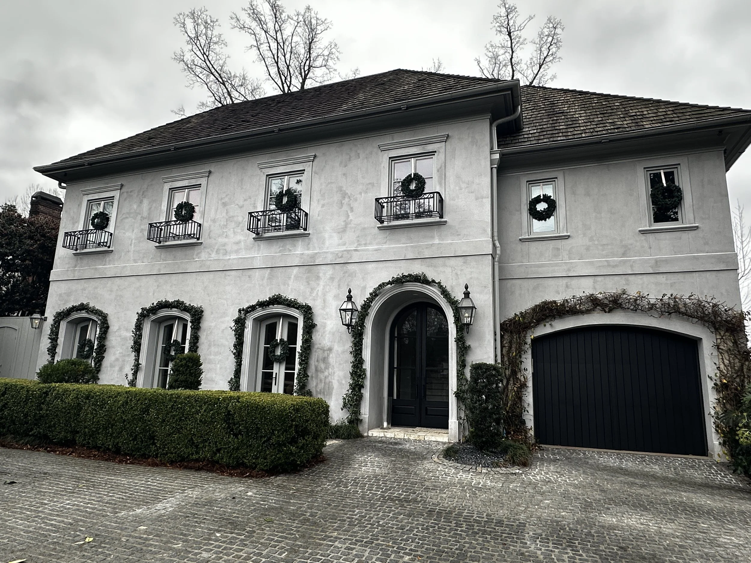 Railings, balconies, and columns add depth, making great places for garland to drape and curve naturally. Think thick, loose swags along a black metal balcony or stone columns in measured spirals with clips hidden and lines straight, so the greenery feels tailored rather than bulky. Don’t forget a tasteful mailbox swag or matching pieces on the gate - small touches that tie the whole property together.